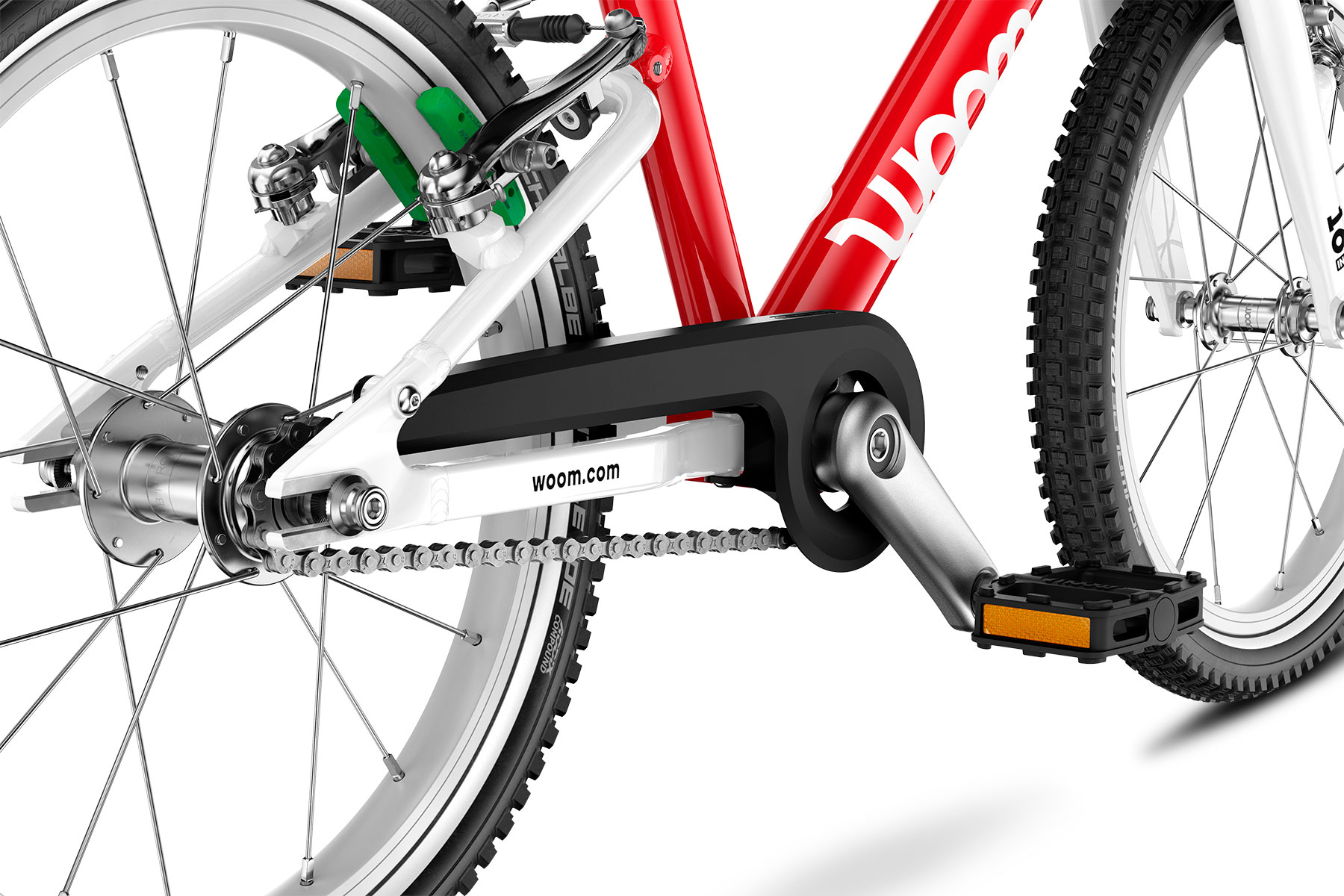 • Kompakt og børnetilpasset kranksæt: Korte pedalarme og snæver Q-faktor giver effektiv og naturlig pedalføring.