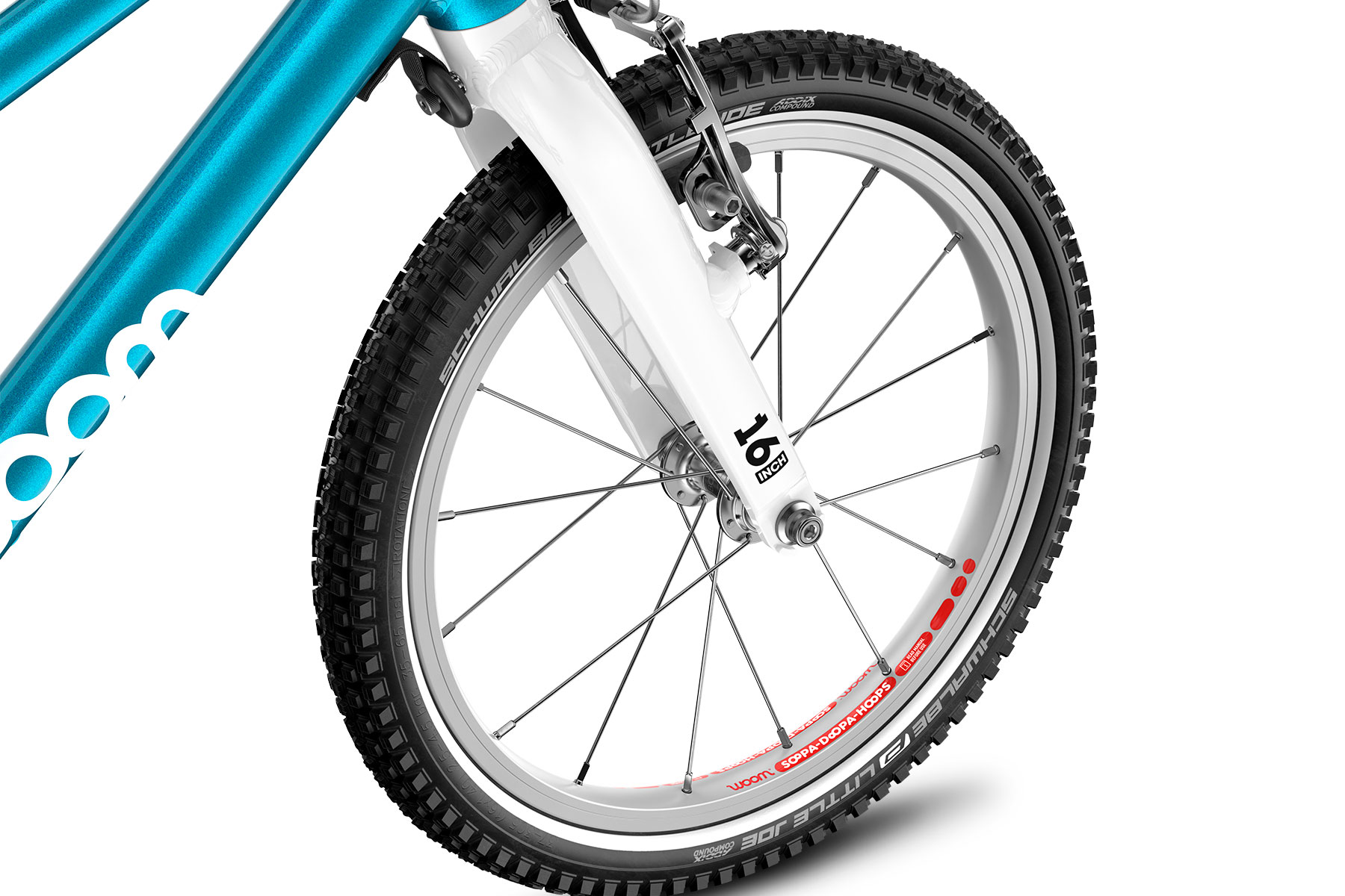 • Letløbende 16" hjul og smalle nav: Maksimal benfrihed og balancevenlig kørsel – perfekt til asfalt, grus og skolegårde.
