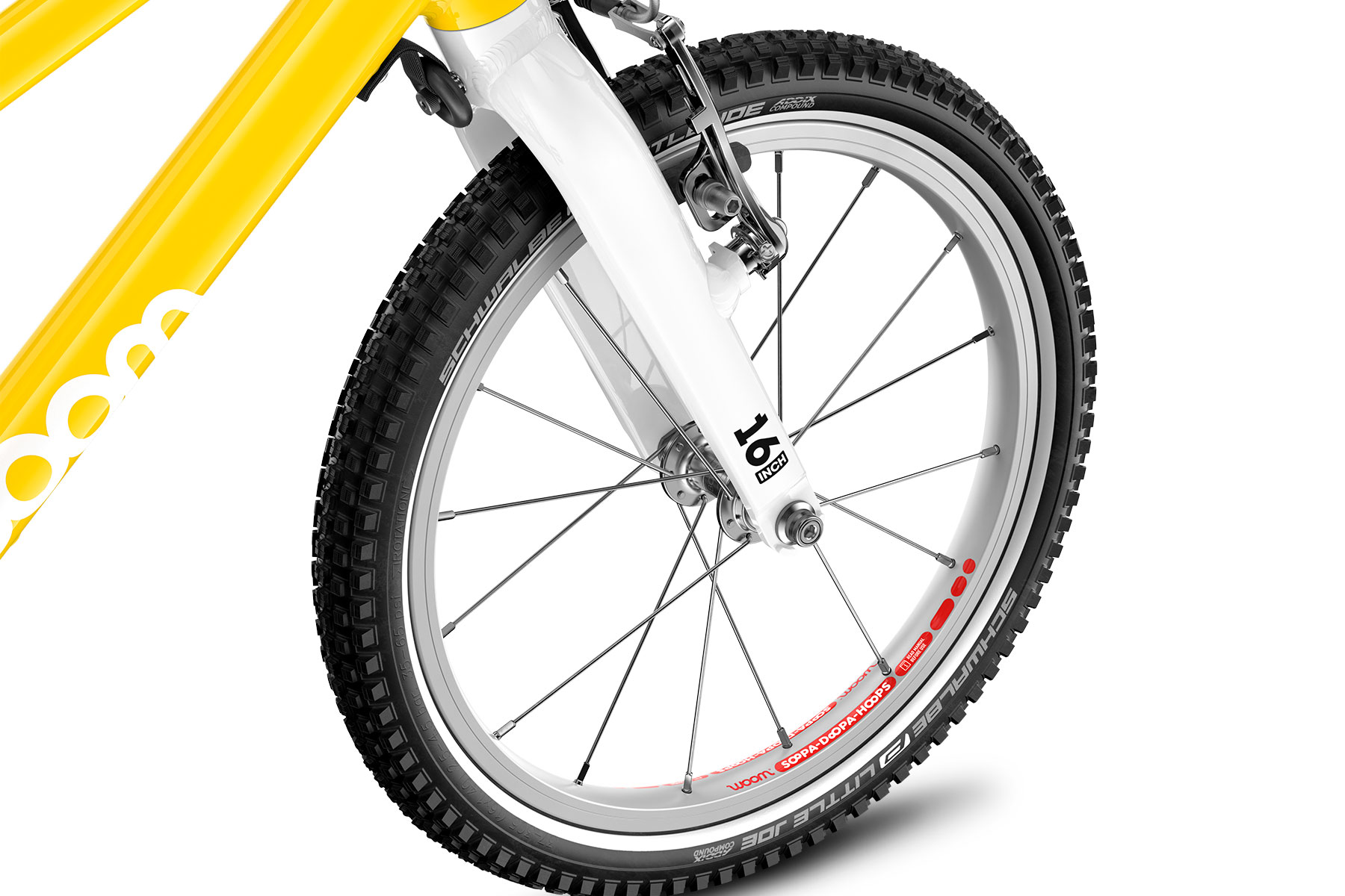 • Letløbende 16" hjul og smalle nav: Maksimal benfrihed og balancevenlig kørsel – perfekt til asfalt, grus og skolegårde.